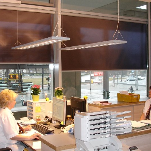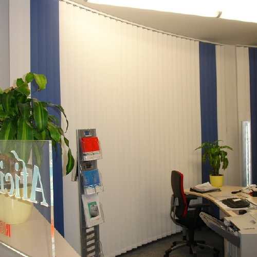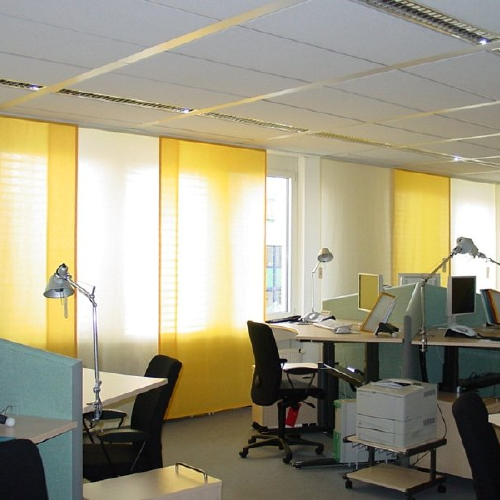 Ausstattung von Objekten mit Sicht - und Sonnenschutz , hier Flächenvorhänge in Büros einer Bank | Ausstattung von Objekten mit Sicht - und Sonnenschutz , hier 150 Blendschutzrollos in einem Bürogebäude | Ausstattung von Objekten mit Sicht - und Sonnenschutzanlagen, hier im DVB Kundenzentrum | Blendschutzrollos im DVB Kundenzentrum zur optimalen Lichtregulation für PC-Bildschirmarbeitsplätze |