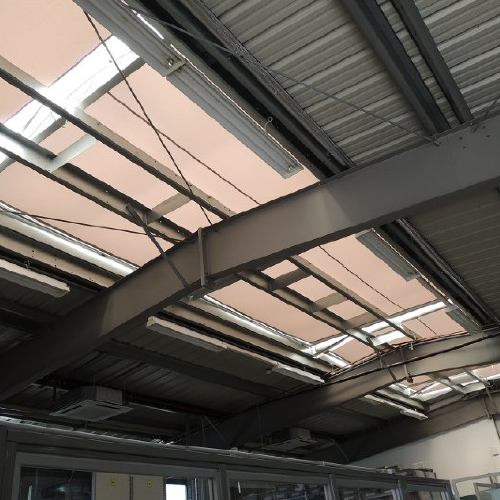 Grenzübergang Breitenau, | Grenzübergang Breitenau, | Oberlichtbeschattung in einer Werkhalle. hier bei der Montage | Oberlichtbeschattung mit aufrollbaren Sonnensegeln, mit Seitenführungsschienen und Kassette |