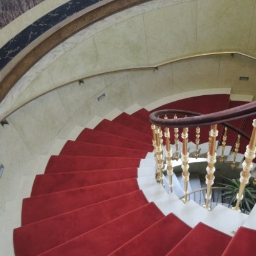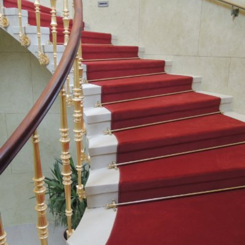Oberlichtbeschattung in einem Verkaufsraum eines Autohauses, hier mit speziell angefertigten Plissee-Anlagen | Lingnerschloss Haupttreppenhaus | Lingnerschloss, Ausstattung des Haupttreppenhauses mit einem repräsentativen roten Teppichbodenläufer | Teppichbodenläufer individuell an die gewendelte Treppe angepasst, mit repräsentativer Messingstange |