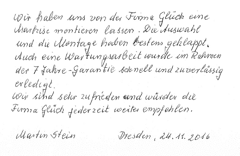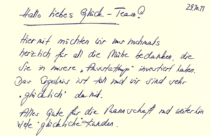 Sowohl Bekannten als auch nachfragenden „Zaungästen“ haben wir positive Auskünfte geben und die Fa. Glück mit bestem Gewissen empfehlen können.