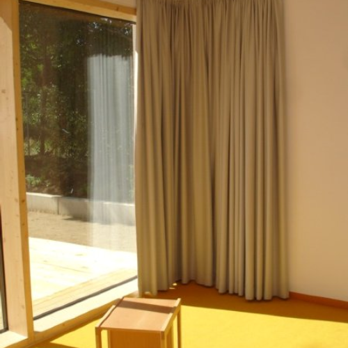 Verdunklungsvorhänge im Schlafbereich eines Kindergartens | Verbeserung der Akkustik durch abgehangene Decken in einem Kindergarten | großflächige Terrassenbeschattung in einem Kindergarten | großflächige Terrassenbeschattung in einem Kindergarten |