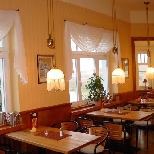 Ausstattung dieses Restaurants mit Gardinen und Polsterarbeiten | klassische Dekorationen passend zum Ambiente | Dekorationen und Polsterauflagen in einem Restaurant im Osterzgebirge | Polsterarbeiten für einen Friseursalon |