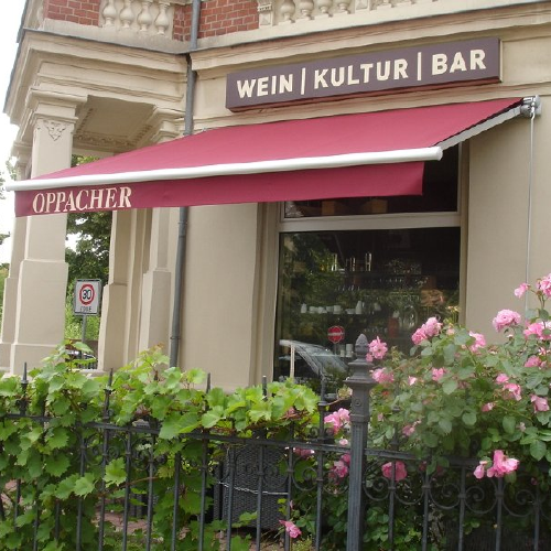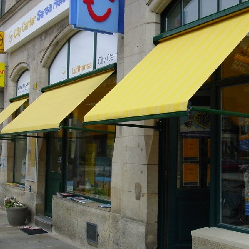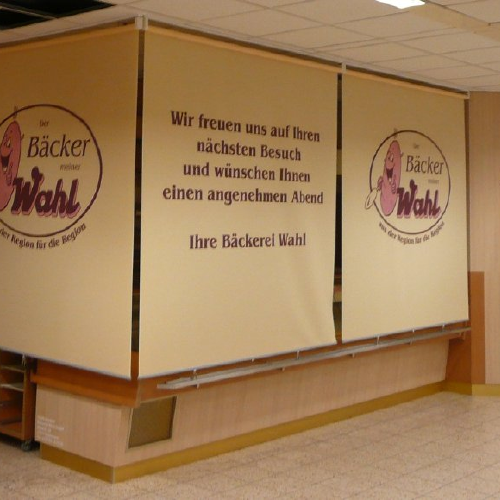 Rollos mit individuellem Druck für eine Bäckerei-Kette | Außenmarkisen für ein Outdoor-Fachgeschäft | Außenmarkise für ein Weinlokal | Außenmarkisen für ein Reisebüro |