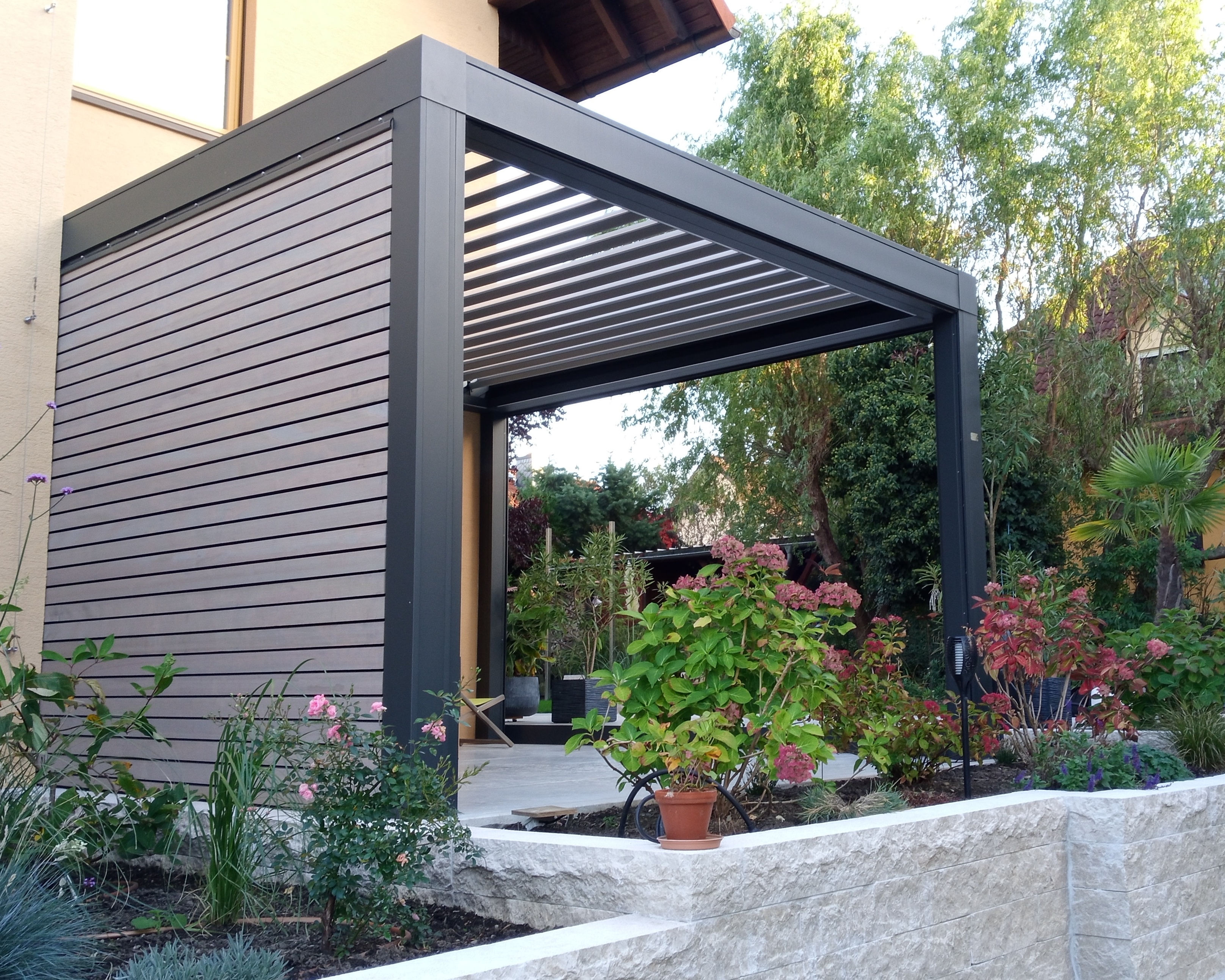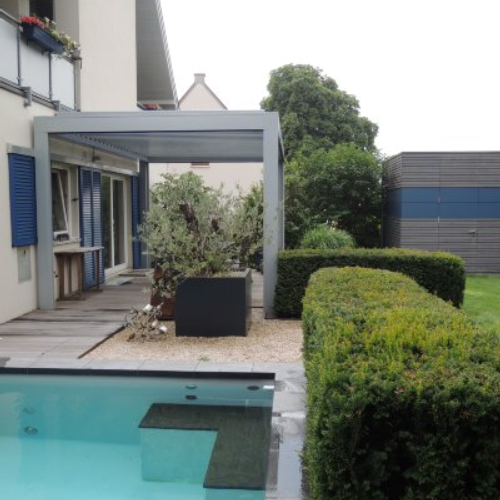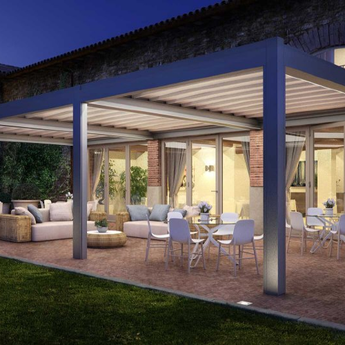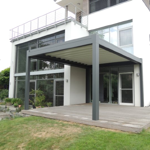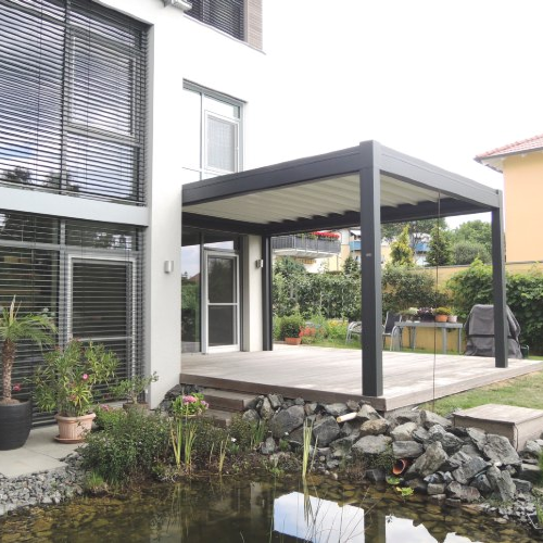 OPERA formt mit elegantem und raffiniertem Dessin eine Schattenspendende Abdeckung mit verstellbaren Aluminium-Lamellen im Dach