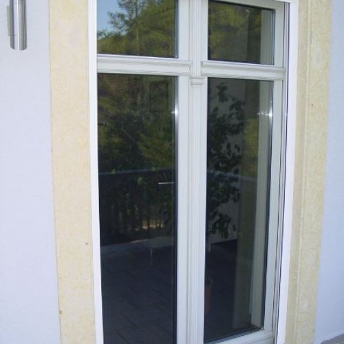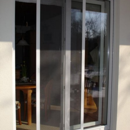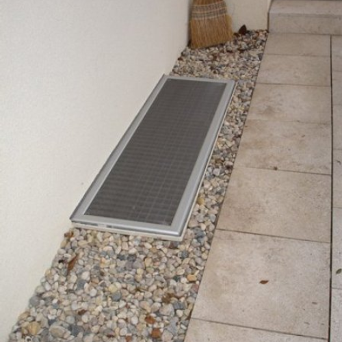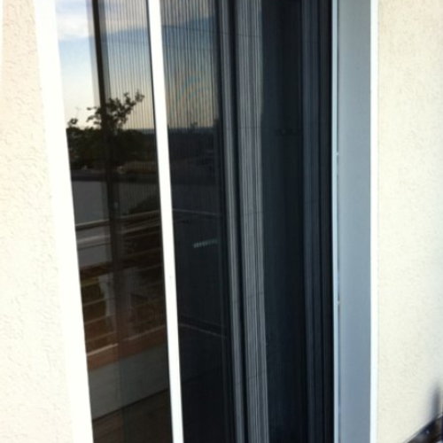Insektenschutzarbeiten, hier eine Insektenschutztür für einen Balkon | Die Lichtschachtabdeckung verhindert ein Eindringen von Insekten aber auch von Laub und Blättern in den Lichtschacht | Spannrahmen in Sonderform | Insektenschutzrollo |