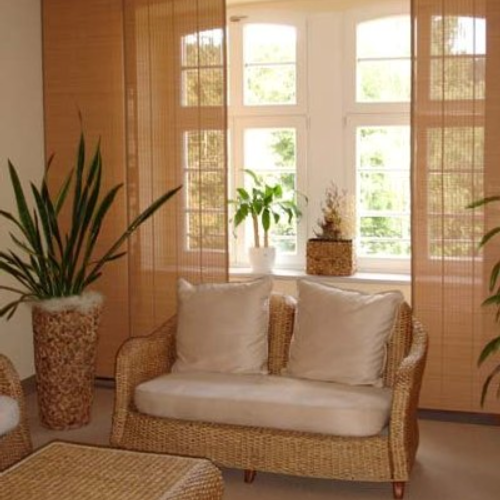 Anfertigung und Montage von Gardinen und Verdunklungs- vorhängen in einem Konferenzraum eines Dresdner Hotels | komplette Ausstattung dieses Hotels im Erzgebirge hier Dekorationen und Sitzkissen im Gastraum | halbtransparente Flächengardinen in einer Arztpraxis | Flächenvorhangsystem mit Holzpaneelen in einem Relaxraum einer Kurklinik. |