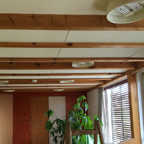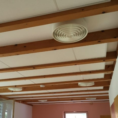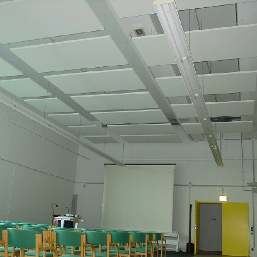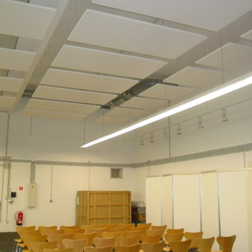Akustikdecke eingepasst zwischen bestehender Holzbalkendecke | abgehängte Akustikplatten im Format 120x120cm und 240x120cm |